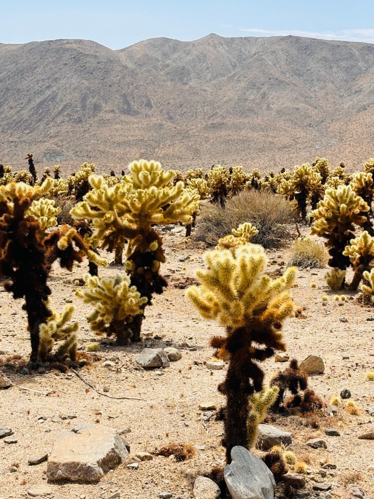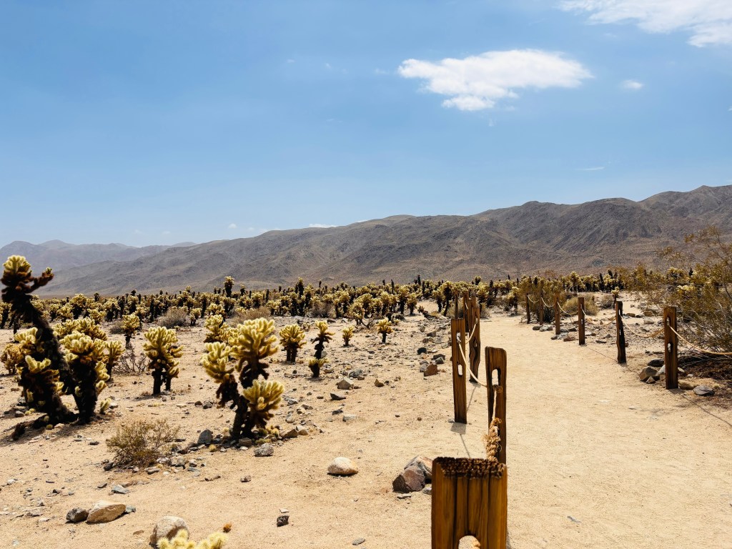 Aujourd’hui un itinéraire pris dans un livre déjà en main de Lonely Planet. On débute par le Joshua Tree National Park, nous avons fait quelques petites randonnées. Très important de bien s’hydrater il fait très chaud par chance il y a un petit vent, il est chaud mais cela nous aide à ne pas complètement brûler. Les rangers attendent à la sortie de certains sentiers pour donner de l’eau aux randonneurs. Le paysage est très arride, toujours impressionnant de voir la végétation qui réussit à faire son chemin dans le désert.