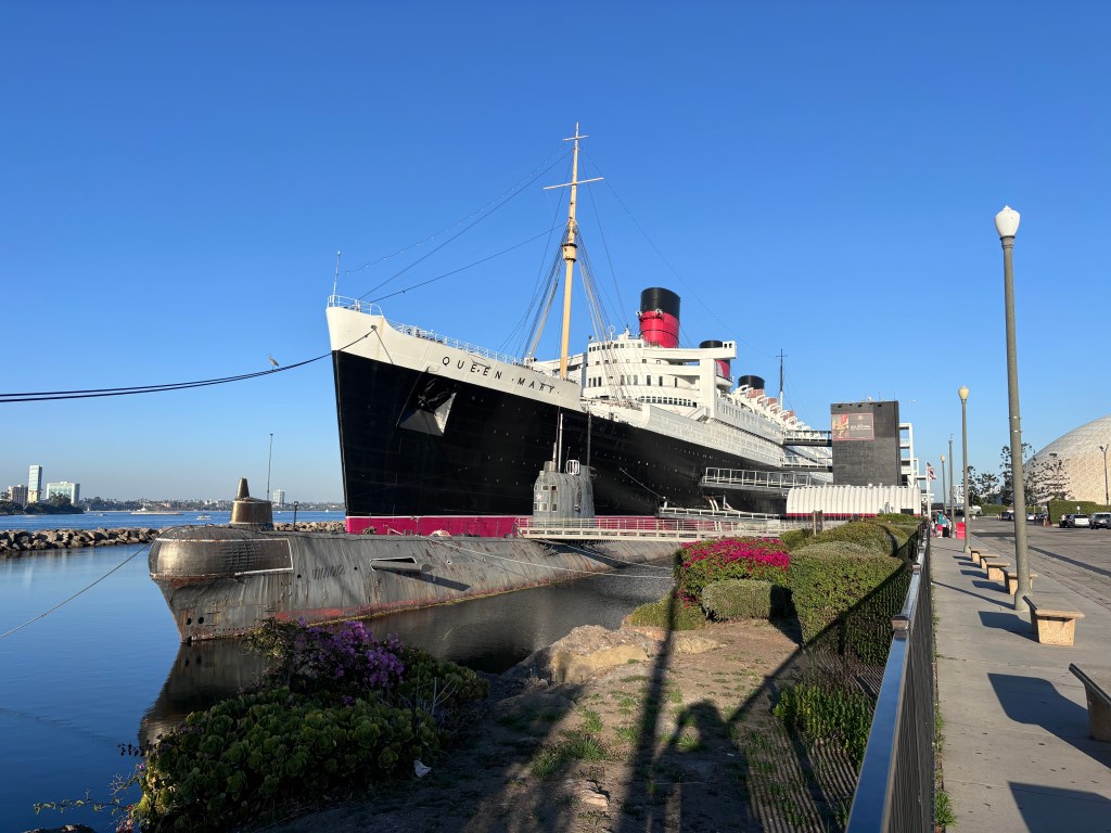 Nous retournons vers notre hébergement à Inglewood tout près de Long Beach, une autre heure plus tard, comme je vous disais, vous allez y perdre autant de temps dans une journée que de visite vous ferez. Long Beach est une ville située dans le sud du comté de Los Angeles, dans l’État de Californie, sur la côte Pacifique des États-Unis. Elle se trouve à 30 km au sud de Downtown Los Angeles. Le port de Long Beach est l’un des ports les plus grands et des plus actifs du monde. Nous avons été zieutés le bateau Queen Mary de l’autre côté.