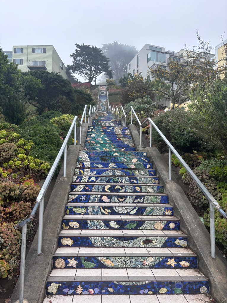 C’est brumeux et nuageux, pour ceux qui connaissent la ville, c’est typiquement San Francisco. Mais cela, ne nous empêche pas de visiter les alentours. On se rend aux 163 marches des Tiled steps, une fois l’ascension faite on ne voit pas vraiment au loin, c’est même pluvieux un peu. C’est là que l’on voit que nous n’avons plus 20 ans et sommes moins en forme.