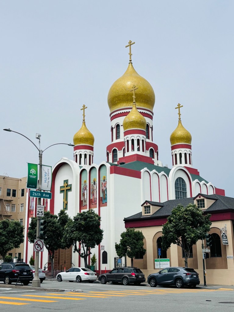 Par la suite, nous nous sommes dirigés vers les archives internet sur Funston Ave c’est ouvert que les vendredis, on ne pourra malheureusement pas y faire la visite. Nous poursuivons à pied pour aller voir l’église Holy Virgin, une église typiquement russe. Ce que j’aime de San Francisco c’est la diversité des quartiers et des cultures. On a les quartiers chinois, russe, hispanique, italien, japonais etc. Chaque quartier possède ses couleurs, sa nourriture typique et son architecture.