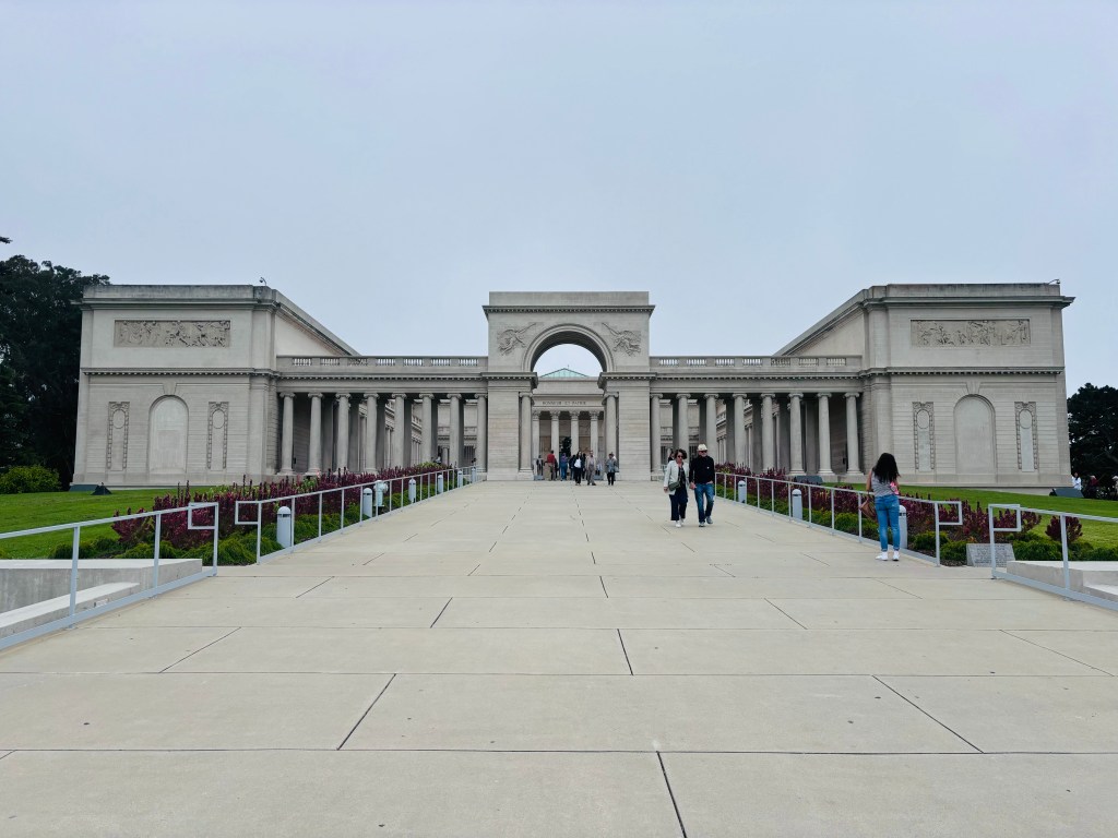 Le prochain quartier que nous découvrirons est Seacliff, qui est à l’opposé du Fisherman Wharf, le côté plus nature et sauvage. On fait la Coast East Trail (environ 3 km), sentier pas trop escarpé mais des marches un peu tout de même, il longe la cote on peut apercevoir par moment le Golden Gate qui apparaît et disparaît dans la brume. Une fois rendu à Eagle point, on revient par la rue et apercevons le musée Legion of Honor inspiré de Paris, l’extérieur est vraiment beau, on constate effectivement que l’architecture n’a rien de californien, je dois avouer que cela détonne dans le décor.