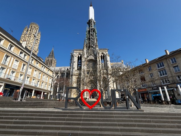 Nous décidons de nous rendre à Rouen, connu pour son impressionnante cathédrale, construite au milieu du 11e siècle, de type gothique. Considérée comme « la plus humaine des cathédrales » par le manque de symétrie de sa façade occidentale, elle est mondialement connue, notamment à travers les 30 tableaux de la série des Cathédrales de Rouen, peints par l’Impressionniste Claude Monet.