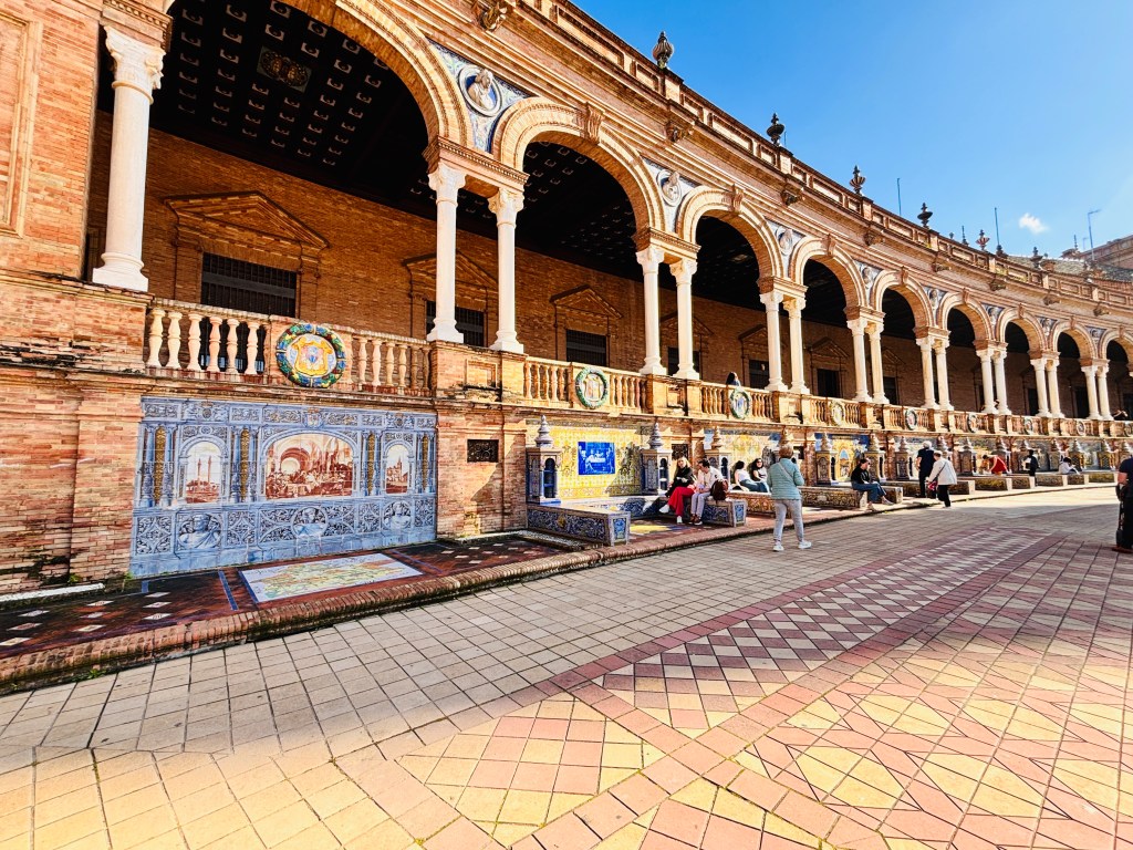 Nous avons opté pour un transport avec le bateau pour nous rendre à Séville (1h30), le point de rencontre était tout près de la Plaça España. Les places centrales sont assez communes en Europe et en Espagne, on n’y échappe pas. Cette Plaça est la plus belle que j’ai vu dans tous mes voyages jusqu’à maintenant, c’était grandiose. La ville est remplie de bâtiments riches en architecture et en histoire, vous serez émerveillez à chaque coin de rue.